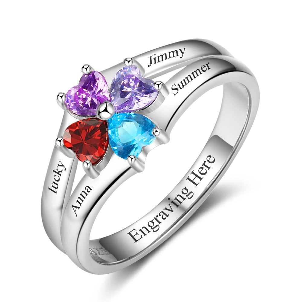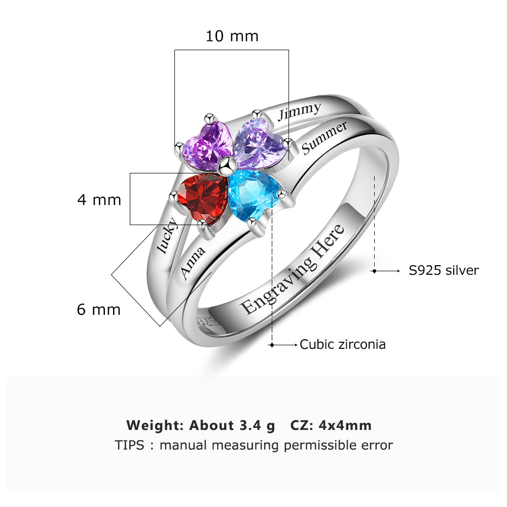 Personalized 4 Birthstone Engrave 4 Name 925 Sterling Silver Ring